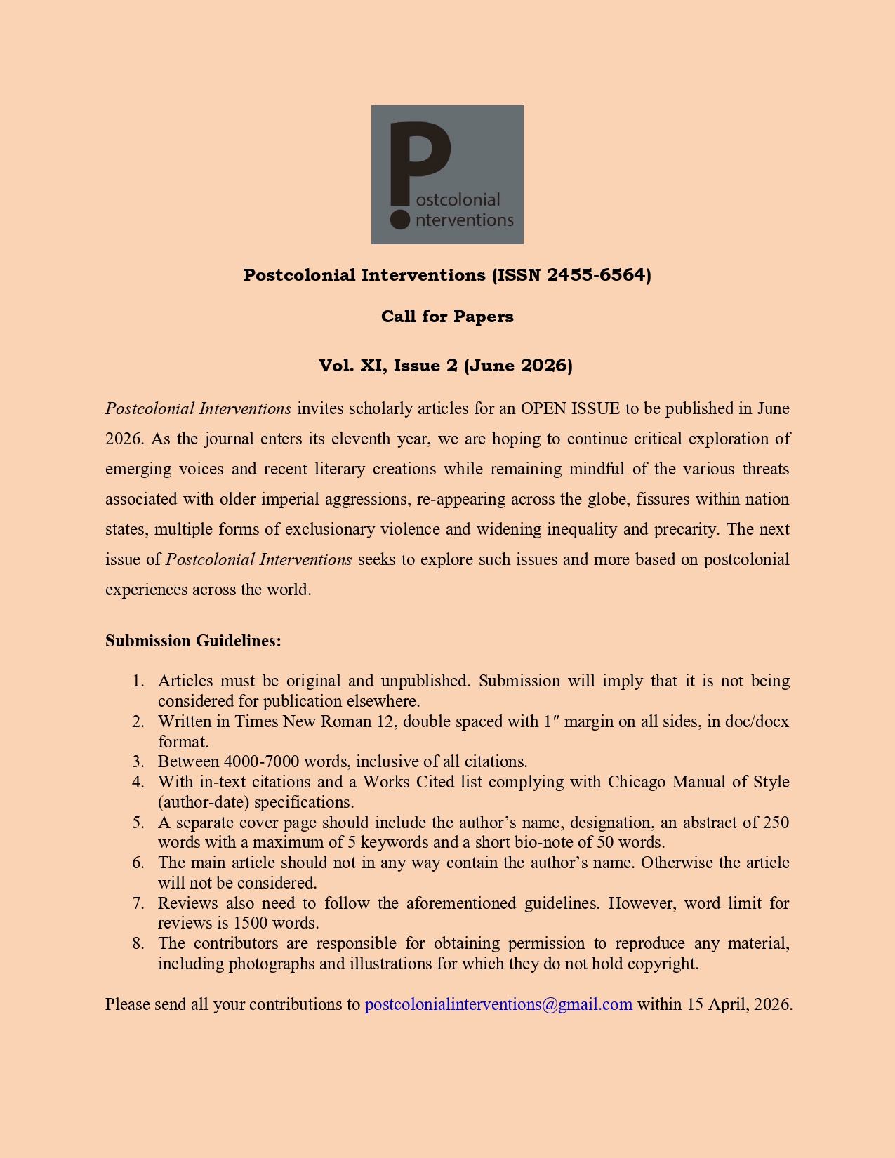 Please send all your contributions to postcolonialinterventions@gmail.com within 15 April, 2026.